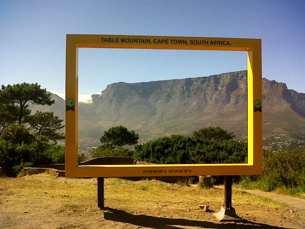Table Mountain is the symbol of Cape Town in the world. This mountain, named because of its flat top, protects the City Bowl and offers a fantastic view of it. When clouds cover the top, Capetonians use to say that the table is set, as it look like a table cloth. It is a Natural World Heritage Site but also one of the New 7 Wonder of Nature selected in 2011. To honour this wonder, the city of Cape Town decided to place yellow frames at 7 different locations to look at Table Mountain from every angle. Giant Yellow Frames This project took shape in partnership with the Cape Town’s World Design Capital 2014 programme. The purpose of the operation is to help tourists to take the best of this monument, but also to remind to the local people the beauty of their Mother City. It is the South African designer Porky Hefer who thought